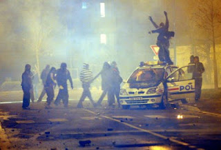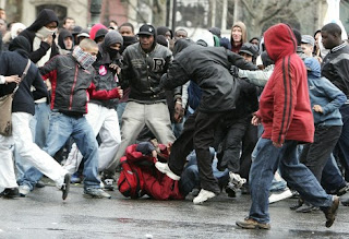 Still and all, the skinhead and antifa violence which is throwing the government into a panic only causes one death every ten years. It's a bad joke compared to the violence by the hoodie brigade [reference to Arab and Afro aggression]. Every single day this violence drives half the country up the wall, it attacks trains, terrorises their passengers, ethnically cleanses neighborhoods, blurs the lines between organized crime and guerilla warfare, rips entire swathes of territory from the Republic, and, by its grip on the [drugs] black market, adds to our widespread stupor...