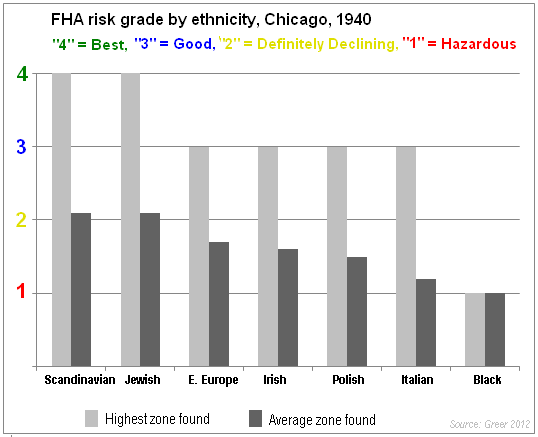 ...Clearly, for some of the city’s residents, all neighborhoods in which they reside are in areas that the HOLC graded as very poor risk. This is the case for all African-American neighborhoods. [...] For all ethnic or racial groups other than blacks, some neighborhoods are graded very poorly while others receive high or very high mortgage risk grades. (1)