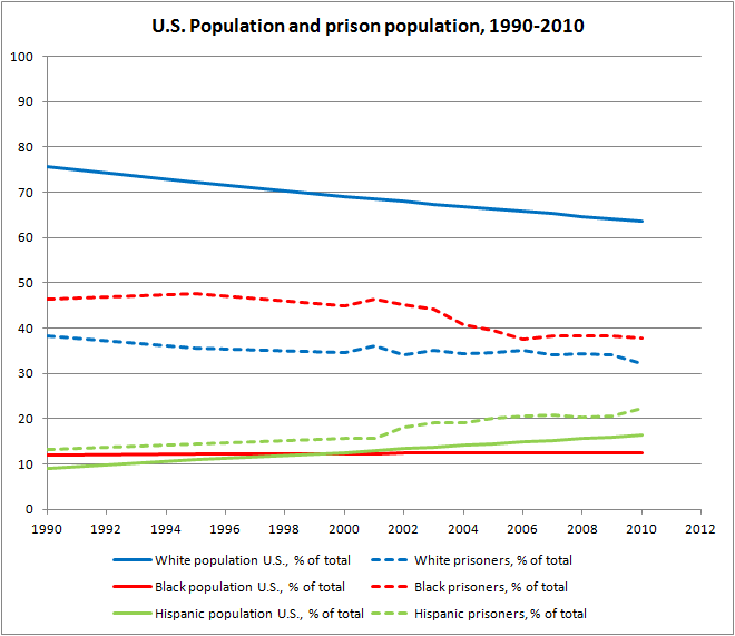 U.S. population versus Prison Population, Black, White, Hispanic