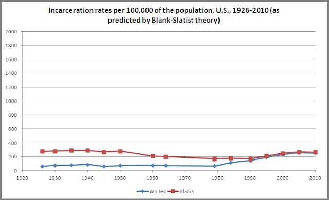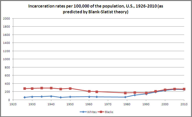 History: Incarceration Rates by Race, U.S., 1926-2010, As Predicted by Blank Slatist Theory & Real